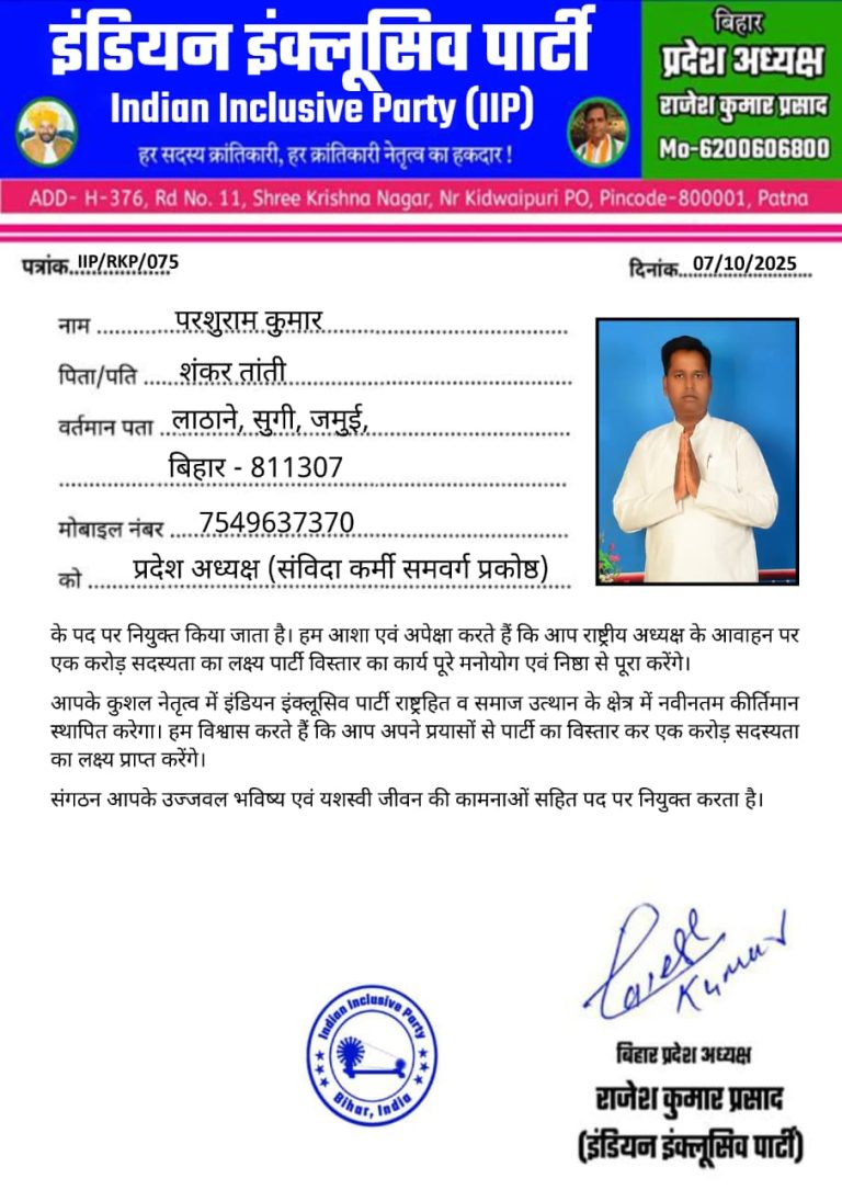 NewsUncategorized 1 week ago1 week ago IIP के प्रदेश महासचिव बने मिथिलेश तांती IIP के प्रदेश अध्यक्ष शुभकामनाएं देते हुए लिखे हैं कि मिथिलेश तांती को महासचिव (बिहार)के…