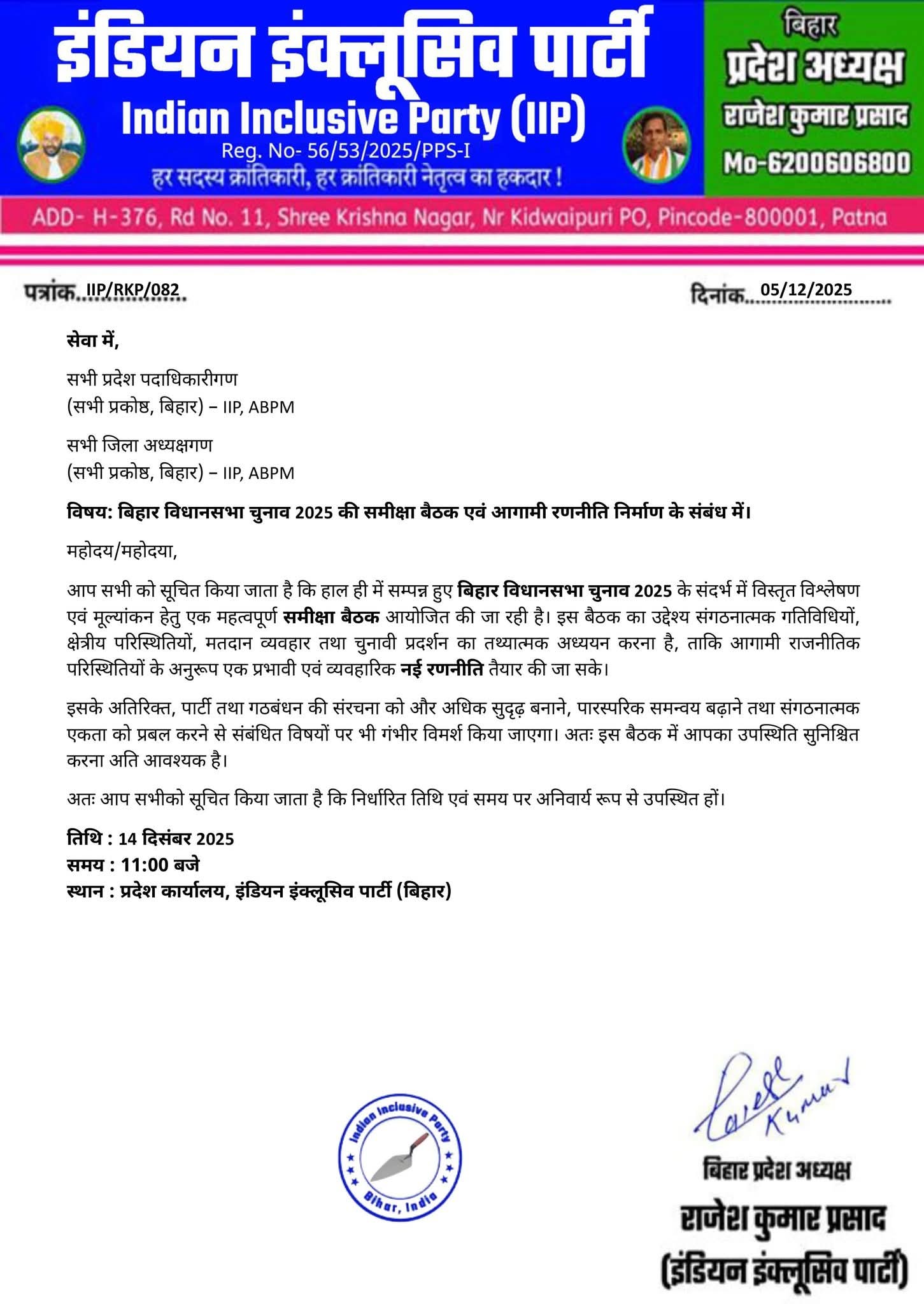 बिहार विधानसभा चुनाव के परिणाम के बाद इंडियन इंक्लूसिव पार्टी(IIP) पटना में करेंगी समीक्षा बैठक, इस बैठक का आह्वान IIP…
