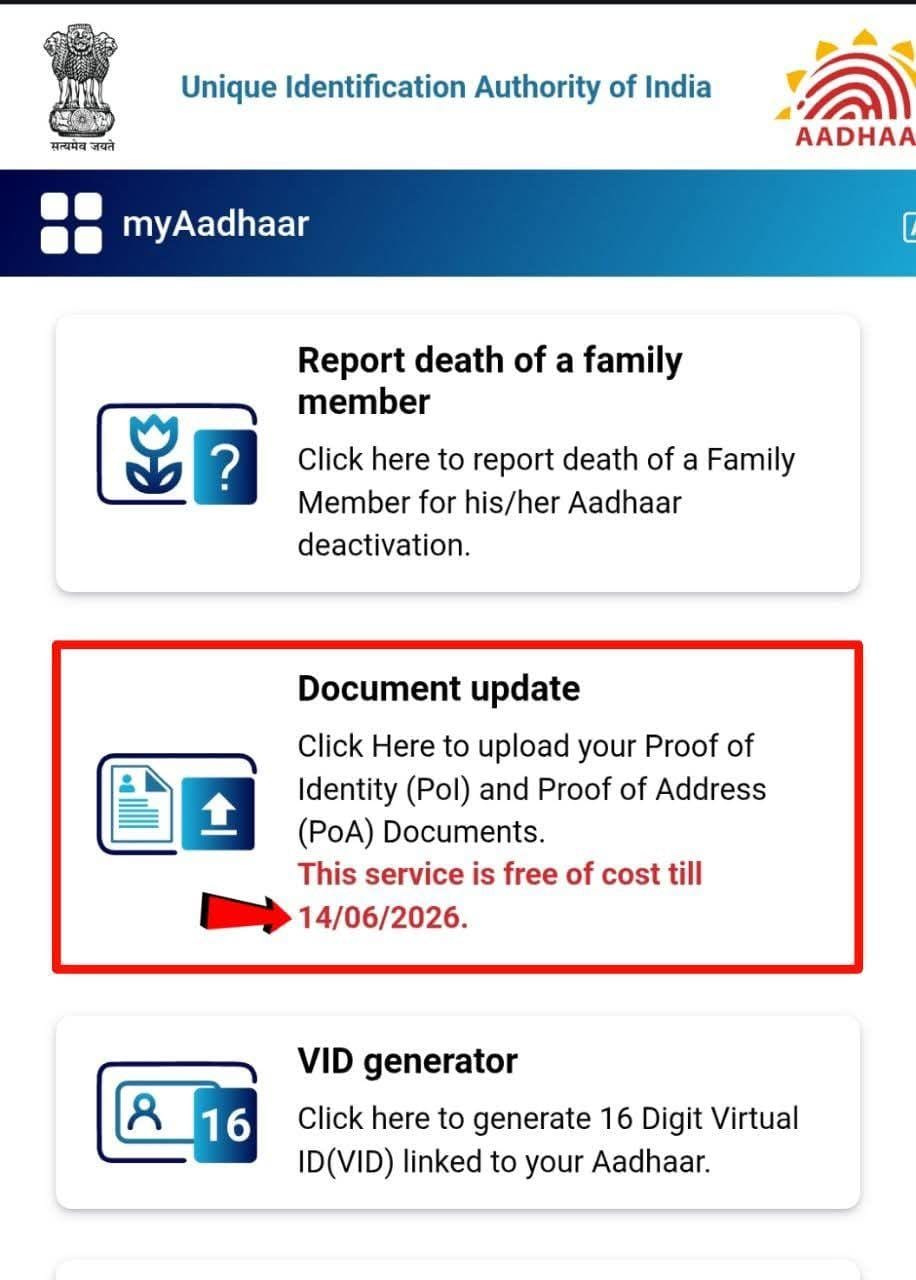 📢 बड़ी खबर! आधार कार्ड डॉक्यूमेंट अपडेट करने की आख़िरी तारीखयदि आपके Aadhaar Card में पुराना या गलत डॉक्यूमेंट जुड़ा…