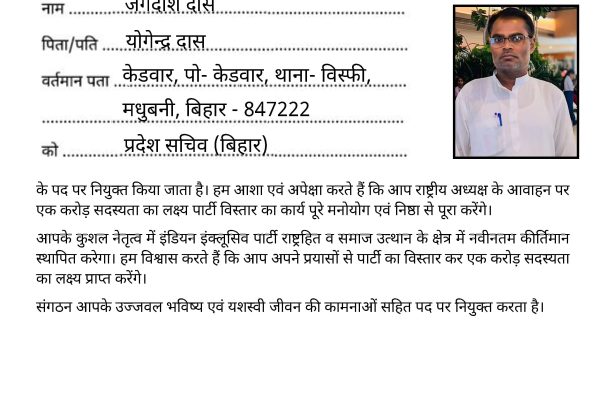 IIP के प्रदेश अध्यक्ष शुभकामनाएं देते हुए लिखे हैं कि मिथिलेश तांती को महासचिव (बिहार)के पद पर नियुक्त किया जाता है। हम आशा एवं अपेक्षा करते हैं कि आप राष्ट्रीय अध्यक्ष के आवाहन पर एक करोड़ सदस्यता का लक्ष्य पार्टी विस्तार का कार्य पूरे मनोयोग एवं निष्ठा से पूरा करेंगे।आपके कुशल नेतृत्व में इंडियन इंक्लूसिव…